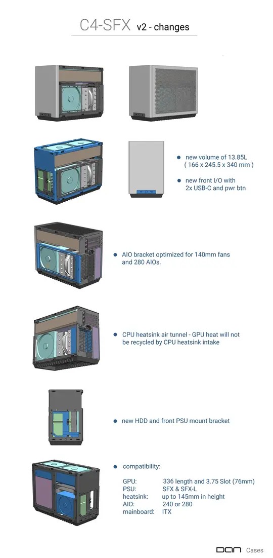 DAN C4 SFX V2The Dan C4-SFX v2 will be13.85L in volume and support only Mini-ITX motherboards. Case pricing is expected to be around £199 / €200 and release date sometime in 2026. Dan Cases is also working on standalone mATX version of C4. The C4-SFX v1 was discontinued after single production run and is EOL.View Gallery SPECIFICATIONS MODEL C4 SFX v2 C4 SFX v1 MATERIALS Steel, Aluminium Steel, Aluminium DIMENSIONS … 350.2×166x274mm (including case feet) VOLUME 13.85 Litres (excluding case …